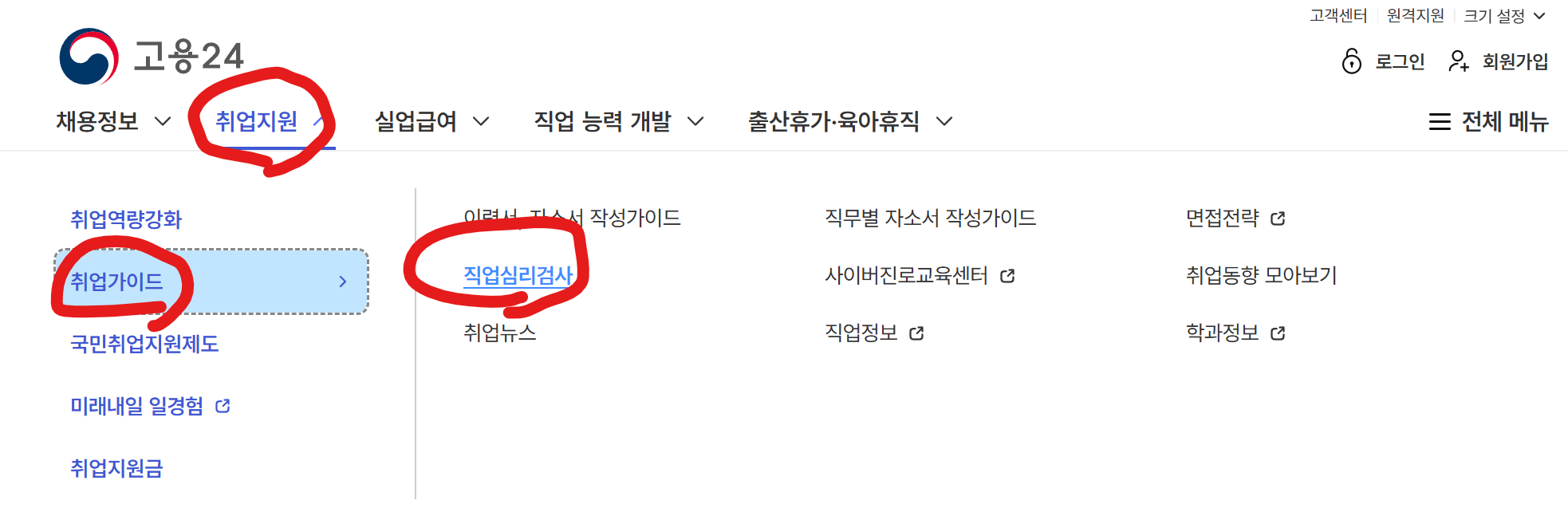 - 회원가입·로그인: 고용24(워크넷) 로그인 후 상단 메뉴에서 취업지원 > 취업가이드 > 직업심리검사로 이동합니다.