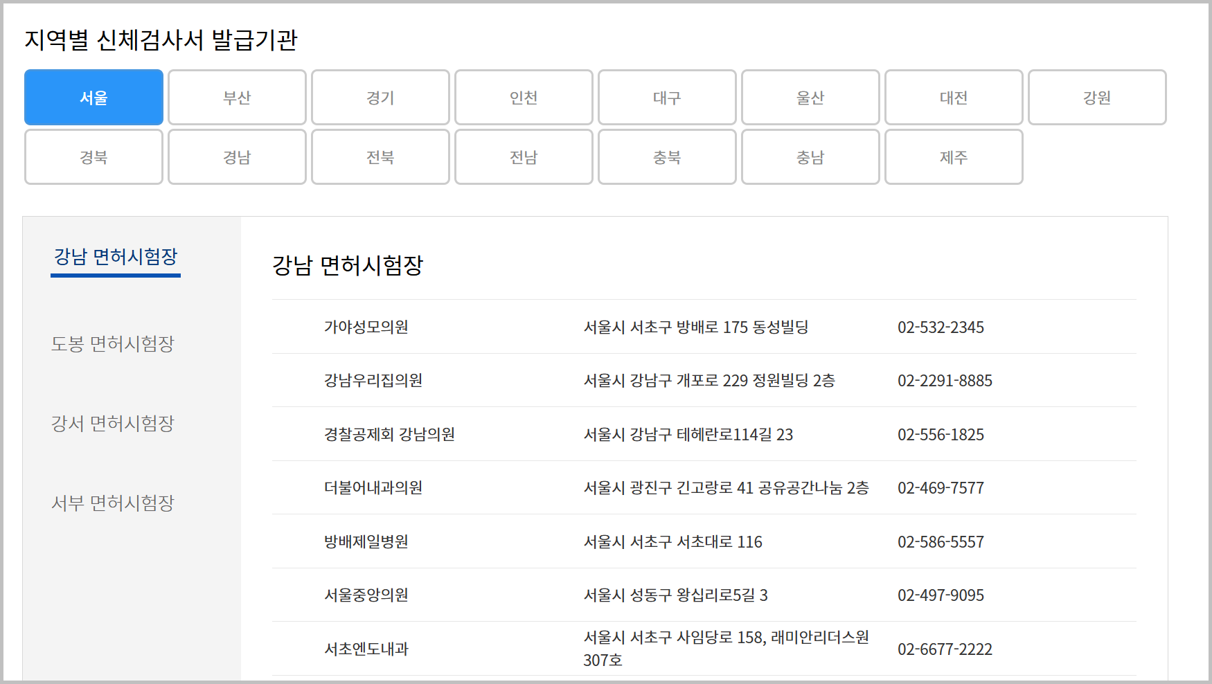- 아니요. 신체검사서 발급이 가능한 병·의원에서만 가능하므로, 반드시 안전운전 통합민원에서 검색 후 전화 확인까지 하세요.