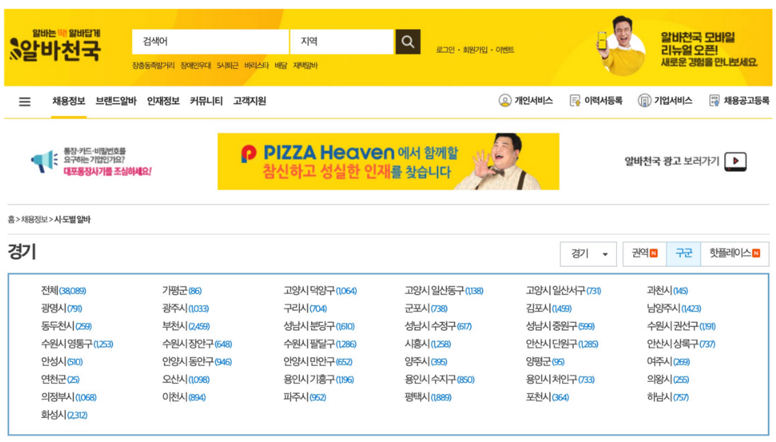 알바천국은 전국을 지역별로 세분화해 검색할 수 있도록 구성되어 있습니다. 특히 경기도처럼 넓은 지역의 경우, 시·군·구 단위로 검색이 가능해 자신의 거주지 근처 일자리를 빠르게 찾을 수 있습니다. 알바는 본업을 병행하면서 하는 경우가 많기 때문에, ‘거리’가 무엇보다 중요하지요. 실제로 경기 지역 페이지에서는 주요 도시별로 카테고리가 나누어져 있으며, 화성, 평택, 수원, 성남 등이 인기 지역으로 꼽힙니다.