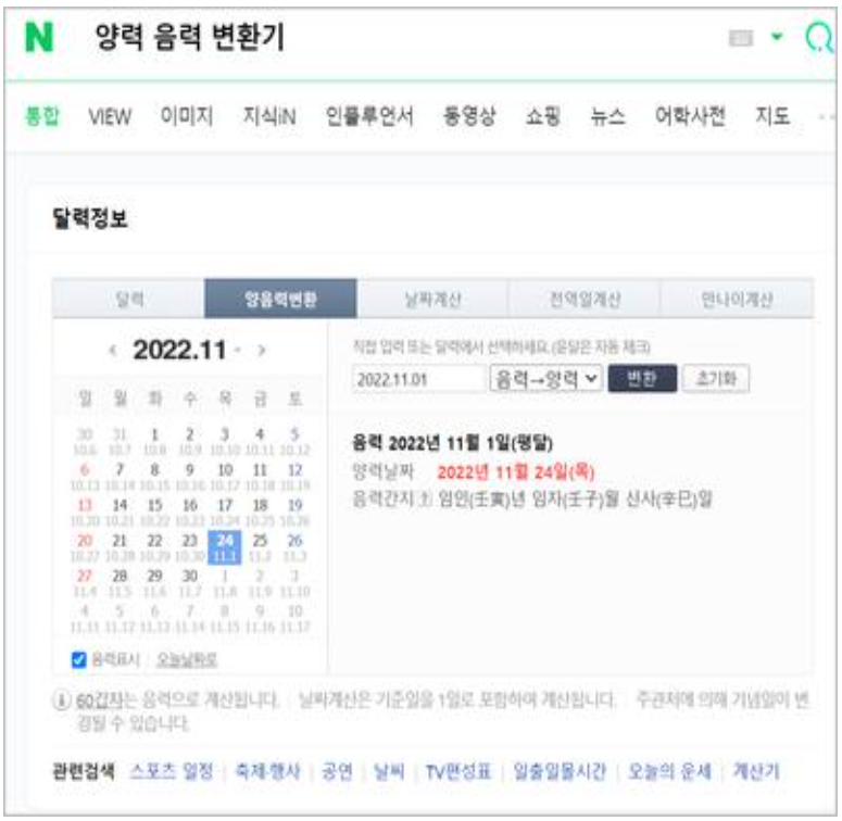 보통 제사나 기제사, 생신, 명절 등은 음력 날짜로 계산해야 하므로 매년 변환이 필요합니다. 포털 사이트에서는 ‘양음력 변환기’만 검색해도 간편하게 사용할 수 있으며, 보다 정확한 계산을 원한다면 한국천문연구원 생활천문관을 이용하는 것이 좋습니다. 날짜를 입력하면 자동으로 변환되고, 윤달 여부나 절기까지 함께 확인할 수 있어 유용합니다.