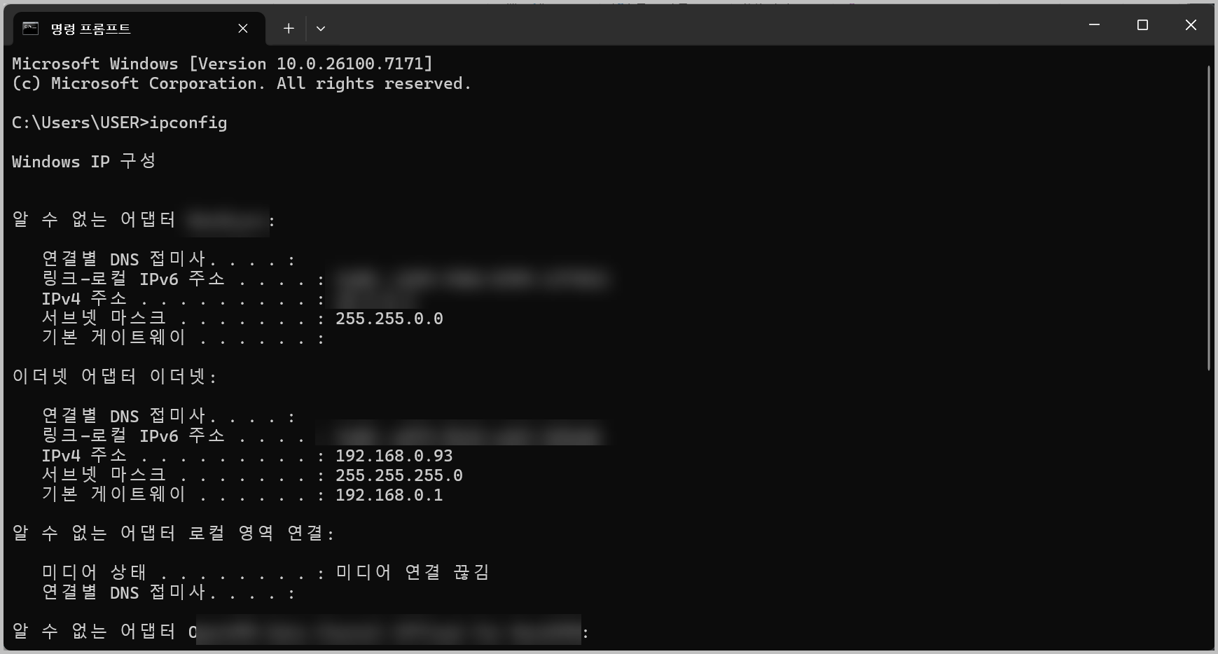 Windows 컴퓨터에서는 실행 창을 여는 단축키인 ‘윈도우 키 + R’을 누른 뒤 cmd라고 입력하면 검은색 명령 창이 나타납니다. 여기에서 ipconfig라고 입력해 실행하면 여러 항목이 나오는데, 그중 IPv4 주소로 나오는 숫자가 내부 IP입니다. 이 숫자는 기기가 공유기로부터 받은 고유 번호라고 보면 됩니다.