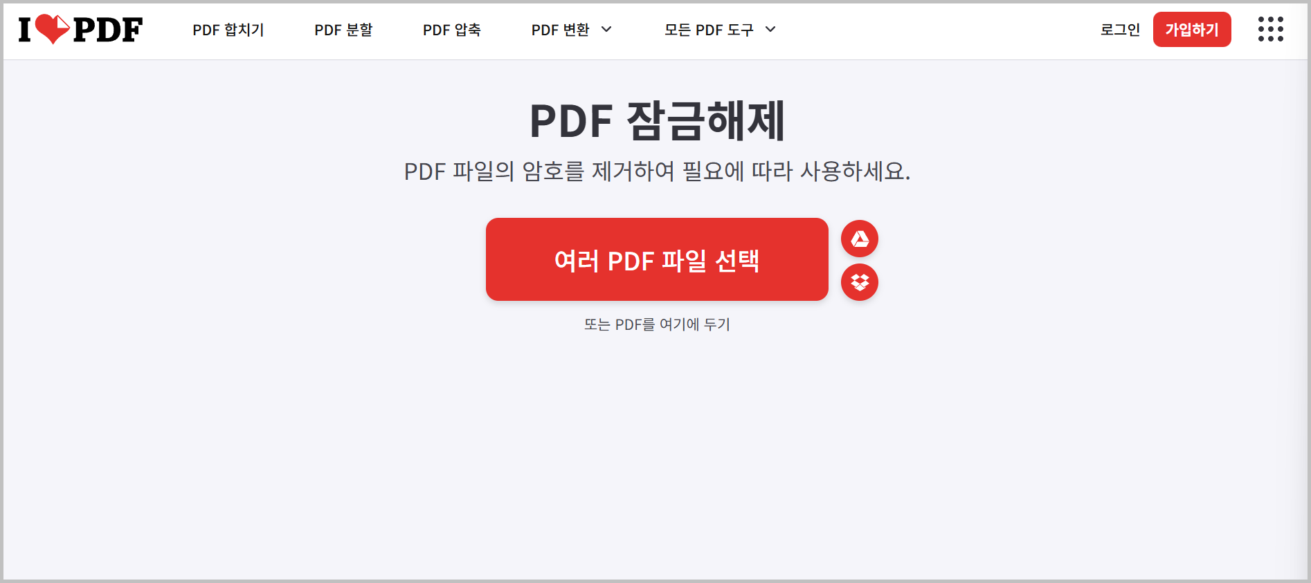 이런 번거로움을 한 번에 해결하는 방법이 바로 웹 기반 도구를 이용하는 것입니다. 그중에서도 iLovePDF는 설치 과정 없이 바로 사용할 수 있어 접근성이 좋습니다. 검색창에 사이트 이름을 입력해 공식 페이지로 들어가면, PDF 관련 기능들이 한눈에 정리되어 있어 처음 접하는 사람도 쉽게 사용할 수 있습니다. 메인 화면에서 자물쇠가 열린 형태의 잠금 해제 기능을 선택하면 바로 비밀번호 제거 작업을 시작할 수 있습니다.