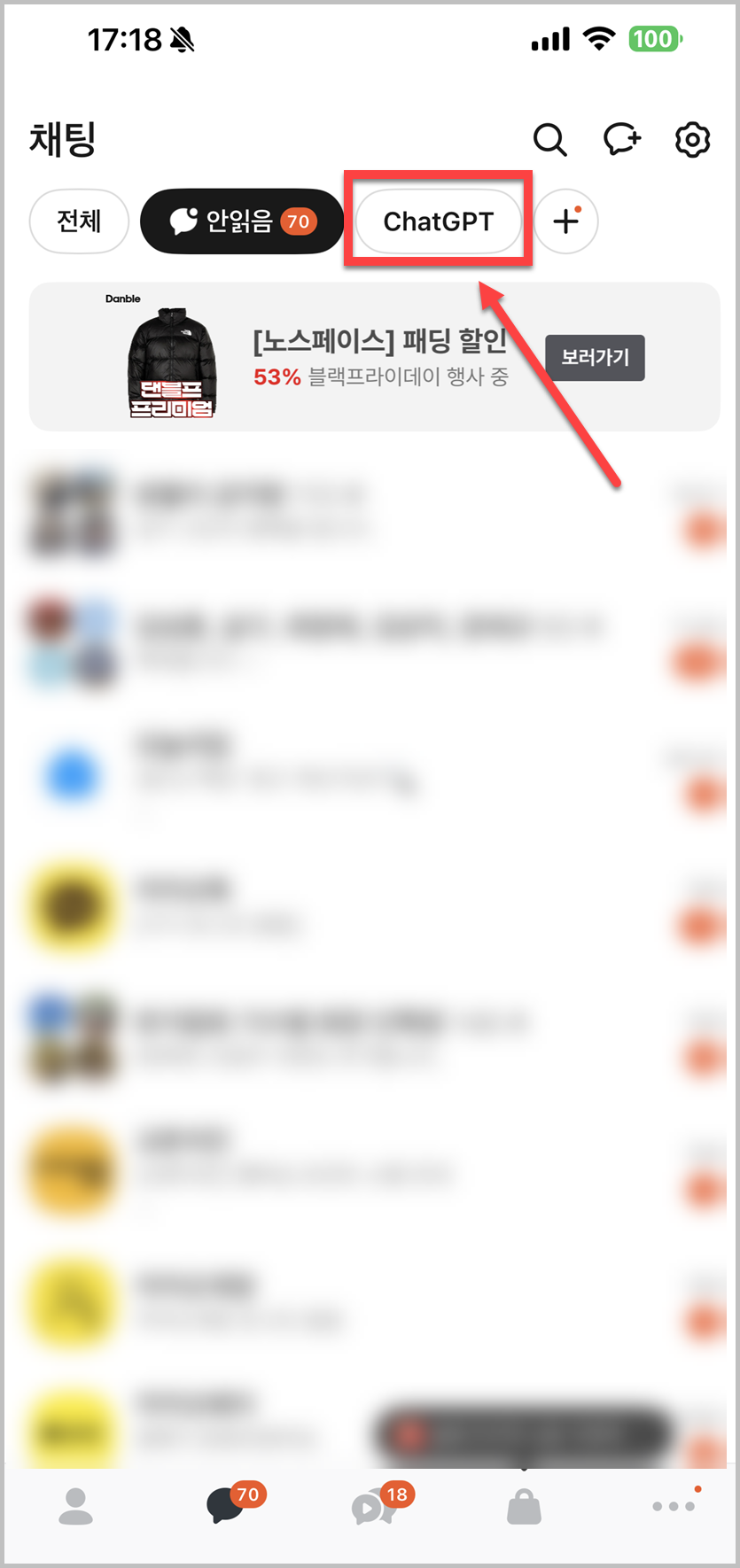 채팅창 맨 위를 보면 ChatGPT라고 되어 있는데 이것을 터치해 주면 됩니다. 만약 안보이면 업데이트를 하면 됩니다.