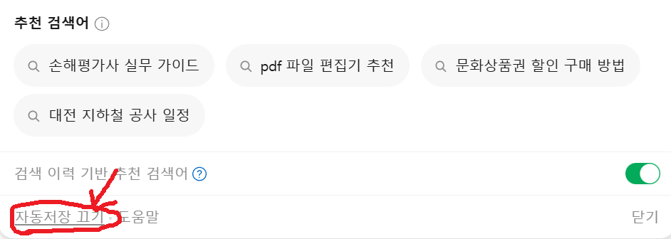 정리가 끝났다면 앞으로 새로 입력하는 검색어가 자동으로 저장되지 않도록 설정을 바꿔 두는 편이 좋습니다. 검색기록 아래쪽에 있는 검색어 저장 끄기 버튼을 누르면 이후부터는 검색한 내용이 앱에 남지 않게 됩니다. 이 기능을 미리 꺼두면 예상치 못한 순간에 사생활이 노출되는 일을 막을 수 있습니다.
