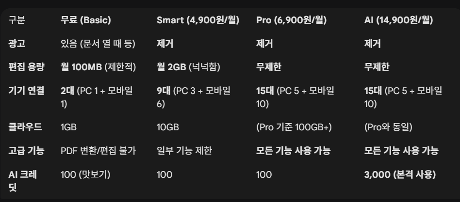 Smart 요금제는 광고 제거와 월 2GB 편집 용량을 제공해 일반적인 문서 작성에는 충분한 여유를 줍니다. 다만 PDF 변환 기능이 완전하게 열리는 것은 아니어서 PDF 작업이 많은 학생이나 직장인이라면 아쉬움이 남을 수 있습니다. Pro는 이런 한계를 한꺼번에 해결해 주며, 기기 연결 수까지 넉넉하게 제공해 여러 환경에서 문서를 다루는 사람에게 적합합니다. 문서 작업이 많은 실무자라면 Pro가 스트레스를 가장 줄여주는 선택이 됩니다.