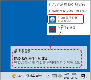 1) 공 CD 삽입: 컴퓨터의 CD/DVD 드라이브에 공 CD-R 또는 CD-RW를 넣습니다. 잠시 후 알림이 뜨거나 “이 PC”에서 드라이브 아이콘이 바뀌는 것을 확인할 수 있습니다.