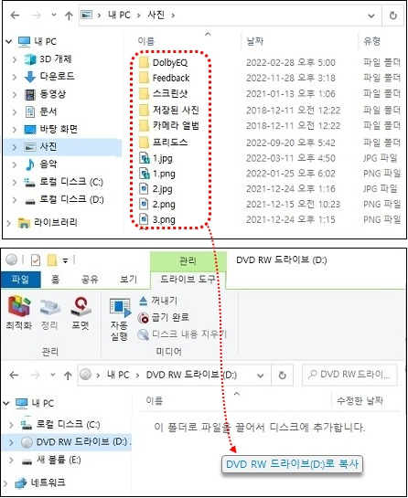 4) 파일 추가: 굽고 싶은 파일과 폴더를 선택해서 CD 드라이브 창으로 드래그앤드롭하거나, 복사 후 붙여넣기(Ctrl+C / Ctrl+V) 합니다. 이 단계에서는 실제로 디스크에 기록된 것이 아니라, 굽기 대기 목록을 만드는 과정입니다.