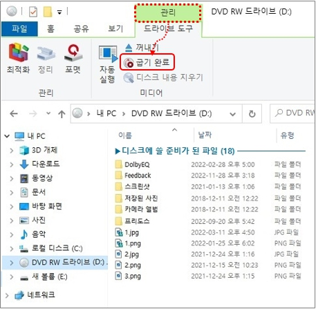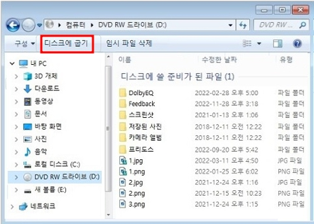 5) 굽기 시작: 파일을 모두 추가했다면, 파일 탐색기 상단 메뉴에서 “드라이브 도구” 또는 “디스크 도구” 탭을 선택하고 “디스크에 굽기” 또는 “굽기 완료”와 같은 항목을 클릭합니다.